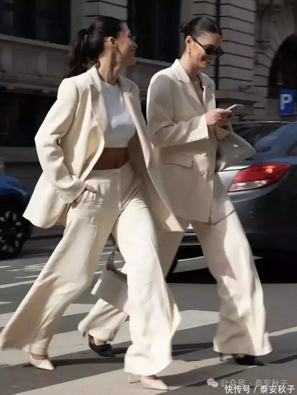 职场女生可以选择一套米白色的西装+阔腿裤,这种颜色的阔腿裤套装会比满大街的黑色西装看起来更柔和,更有温度,也更适合深秋季节里穿着。